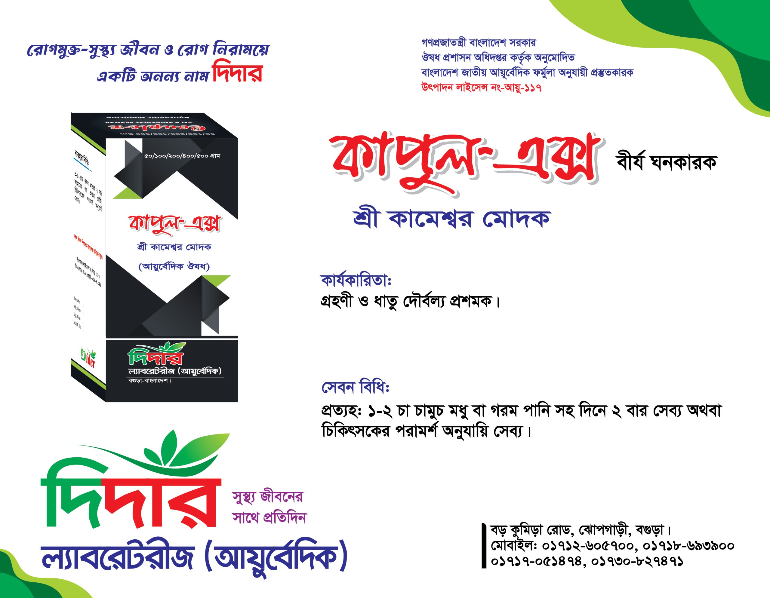 প্রত্যহঃ ১-২ চা চামুচ মধু বা গরম পানি সহ দিনে ২ বার সেব্য অথবা চিকিৎসকের পরামর্শ অনুযায়ি সেব্য।